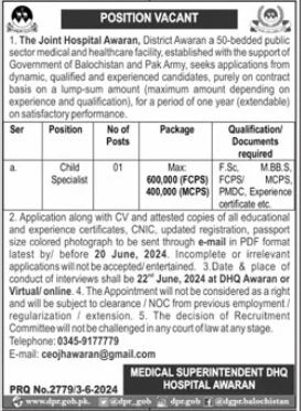 Joint Hospital is looking for candidates for following posts as per job advertisement published in daily Jang Newspaper of June 4, 2024 for location Awaran, awaran Balochistan Pakistan: