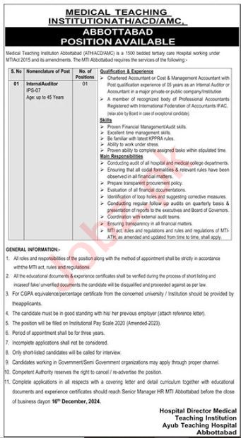 Medical Teaching Institution MTI invites applications for job positions advertised in daily The News dated 1 December 2024 for following vacancies in Abbottabad, abbottabad Khyber Pakhtunkhwa KPK Pakistan.