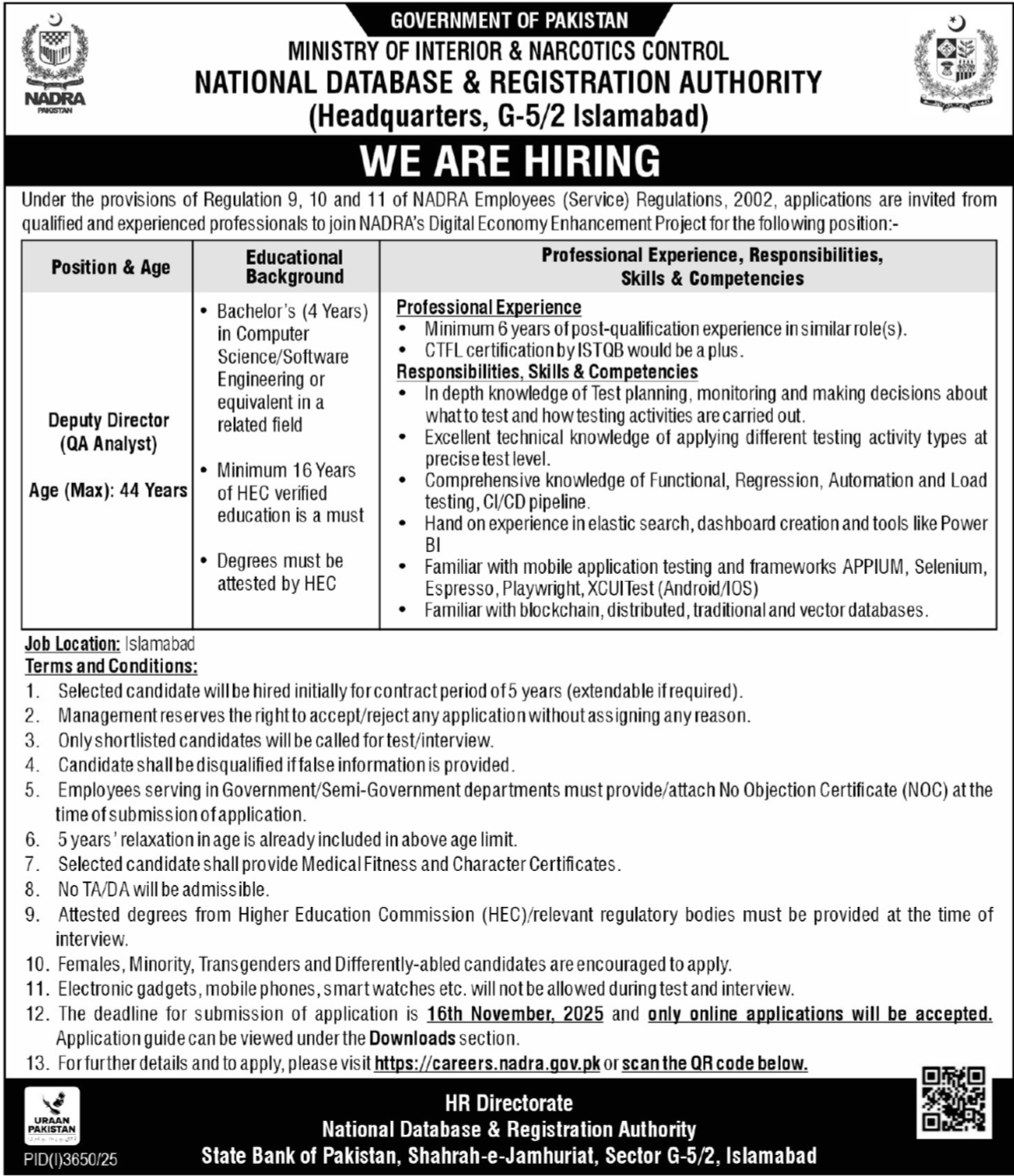 National Database & Registration Authority NADRA jobs advertisement dated about 3 November 2025 in daily Express Tribune Newspaper invites application for the vacant post of qa analyst and deputy director in G-5 Islamabad, islamabad Islamabad Pakistan. Candidates with BIT, BCS and Bachelor etc. educational background will be preferred.