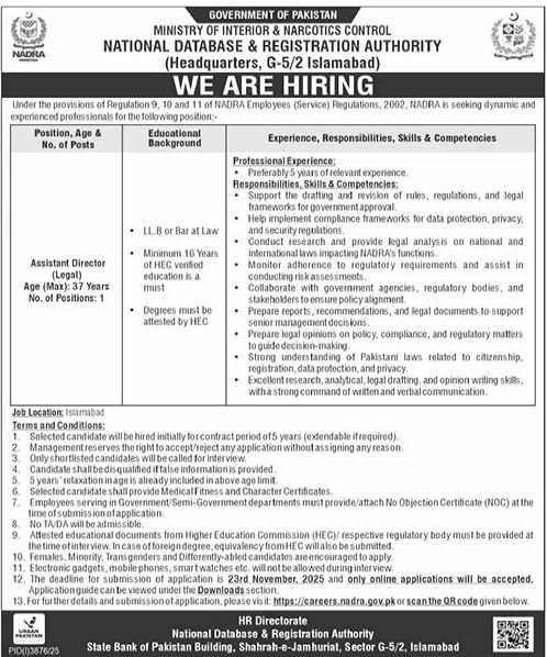 National Database & Registration Authority NADRA invites applications for job positions advertised in daily The News dated 10 November 2025 for following vacancies in G-5 Islamabad, islamabad Islamabad Pakistan.