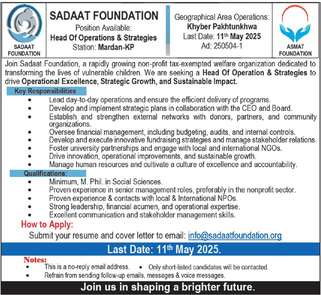 Vacancies in Sadaat Foundation Advertisement May 2025