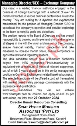 Sidat Hyder Morshed Associates jobs advertisement dated about 13 October 2024 in daily Jang Newspaper invites application for the vacant post of managing director and chief executive officer ceo in Karachi, karachi Sindh Pakistan. Bachelor and Master etc. educational qualification will be preferred.
