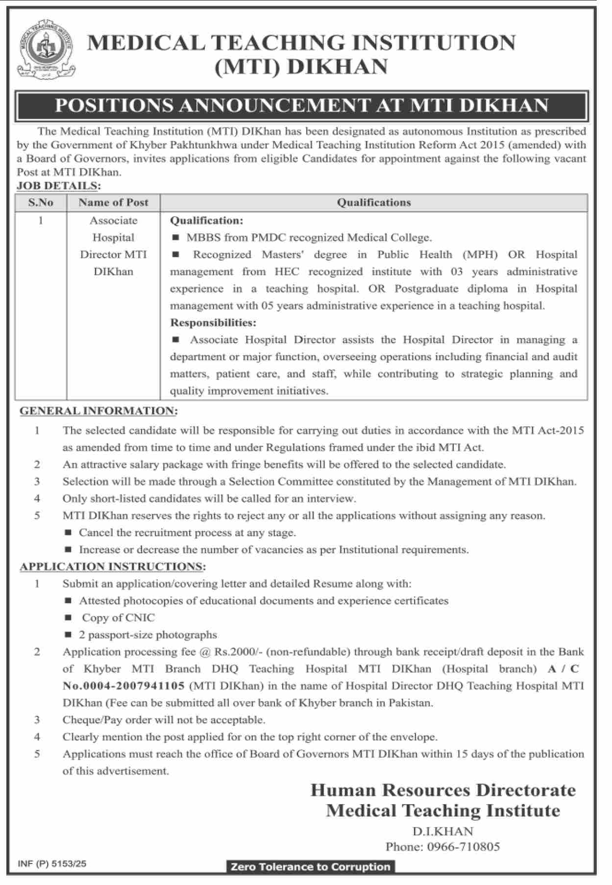 Medical Teaching Institution MTI jobs advertisement dated about 6 December 2025 in daily Dawn Newspaper invites application for the vacant post of associate hospital director in Dera Ismail Khan, dera ismail khan Khyber Pakhtunkhwa KPK Pakistan. Preferred Education is MBBS etc.