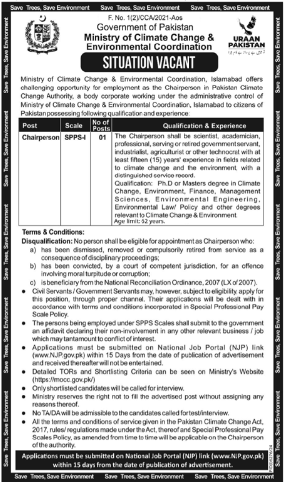Ministry of Climate Change jobs advertisement dated about 15 March 2025 in daily Khabrain Newspaper invites application for the vacant post of chairperson in G-5 Islamabad, islamabad Islamabad Pakistan. Educational qualifications required Phd etc.
