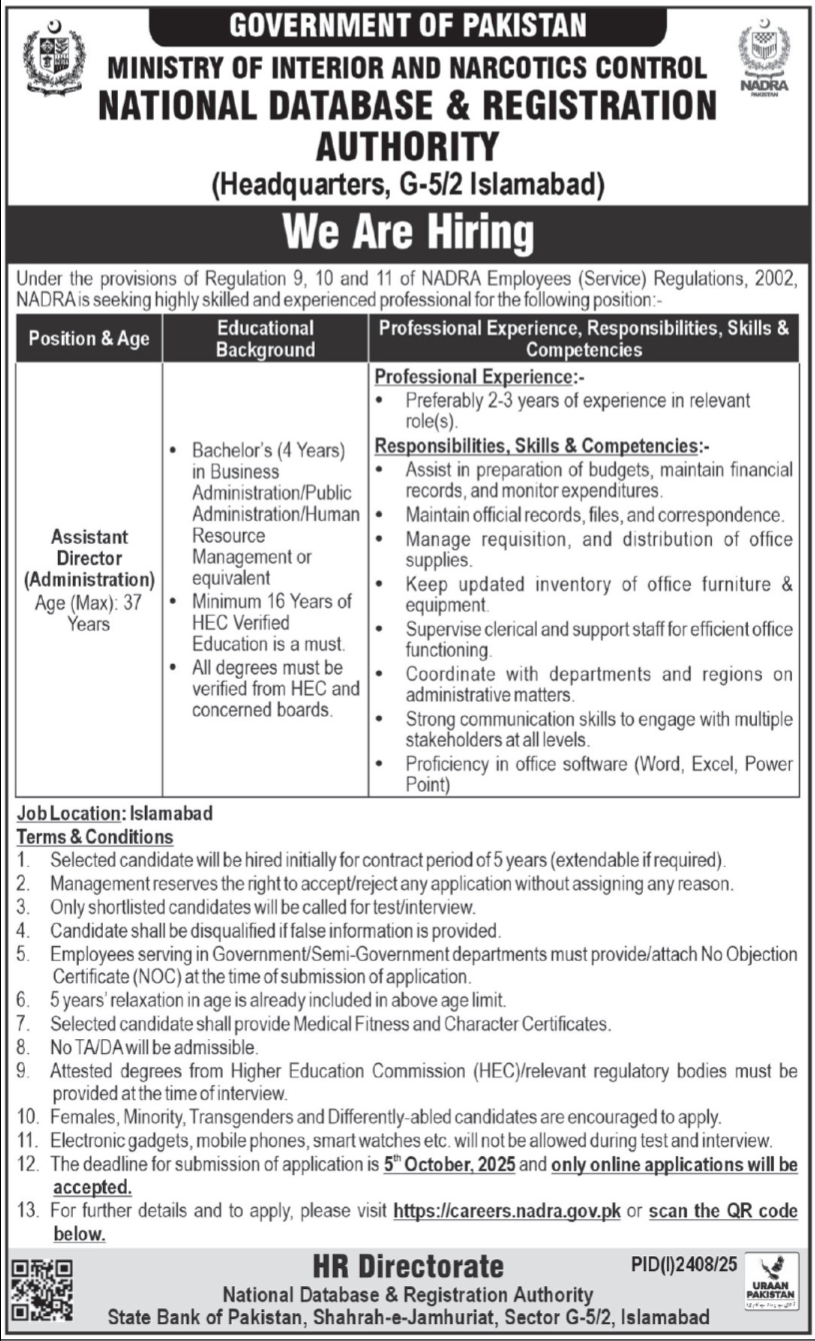 National Database & Registration Authority NADRA is looking for candidates for following posts as per job advertisement published in daily Express Tribune Newspaper of September 21, 2025 for location G-5 Islamabad, islamabad Islamabad Pakistan: