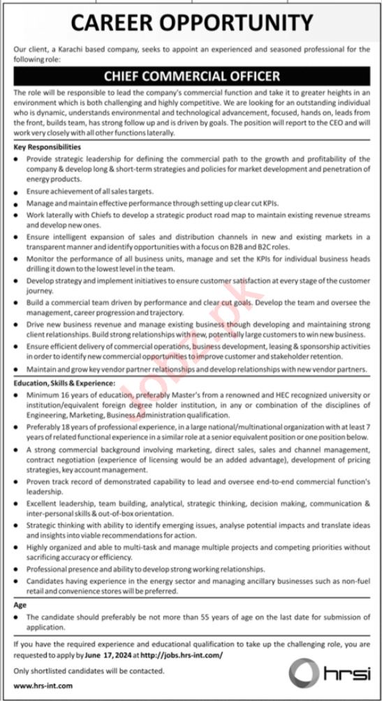 Human Resource Solution International HRSI jobs advertisement dated about 3 June 2024 in daily Jang Newspaper invites application for the vacant post of chief commercial officer in Karachi, karachi Sindh Pakistan. Persons with Bachelor and Master etc. education can apply.