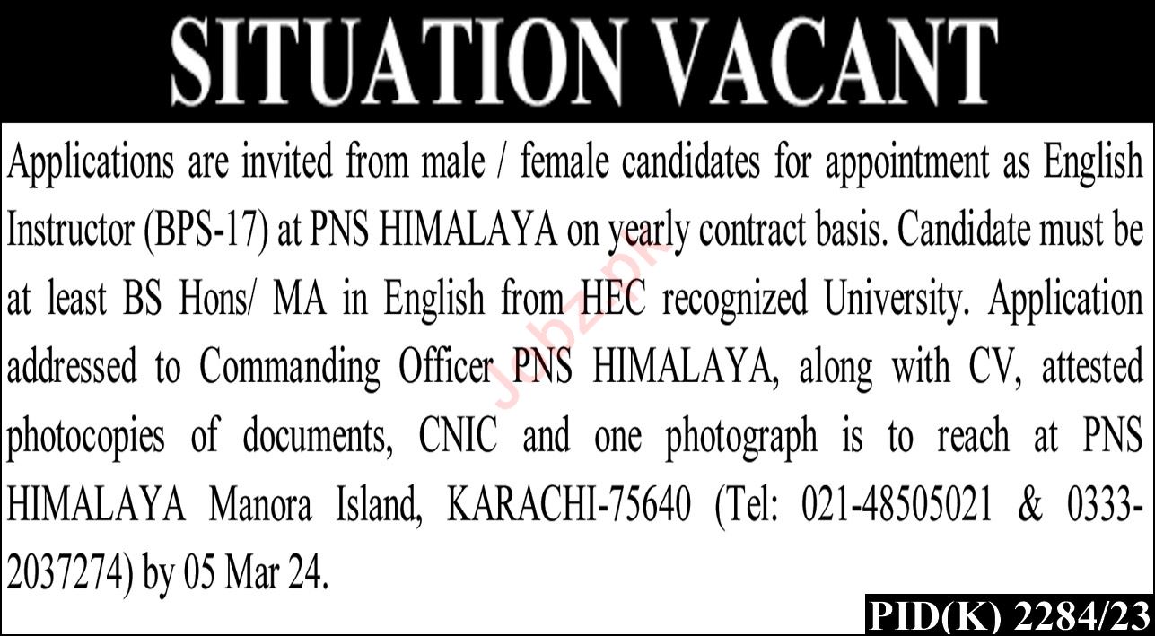 Pakistan Navy Karachi, karachi Sindh Pakistan invites applications from eligible candidates for the post of english instructor as per advertisement of February 18, 2024 published in daily Nation Newspaper. MA etc. educational qualification will be preferred.
