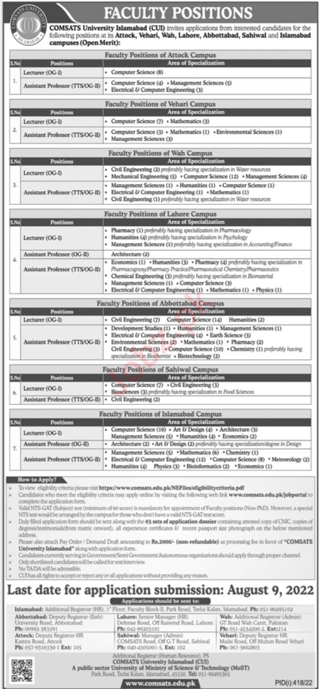 Vacant posts including lecturer and assistant professor are announced in Comsats University Islamabad, islamabad Islamabad Pakistan as per 24 July 2022 advertisement in daily Jang Newspaper. Phd, Master, Mphil and Bachelor etc. educational qualification will be preferred.