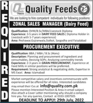 Quality Feeds is looking for candidates for following posts as per job advertisement published in daily Jang Newspaper of July 17, 2022 for location Islamabad, islamabad Islamabad Pakistan: