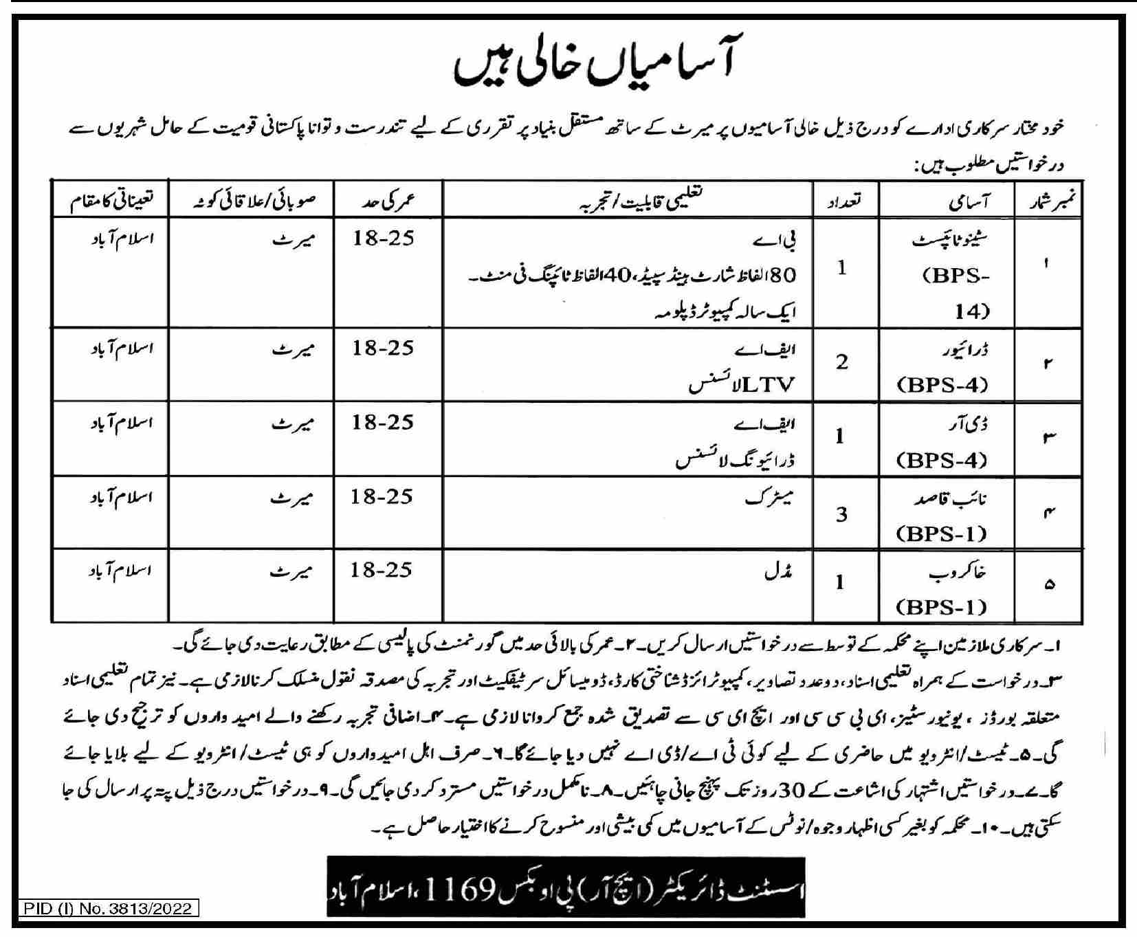 Government Organization jobs advertisement dated about 19 December 2022 in daily Dawn Newspaper invites application for the vacant post of dr, khakrob, stenotypist, driver and naib qasid in Islamabad, islamabad Islamabad Pakistan. Educational qualifications required Intermediate, Matric, Middle and Bachelor etc.