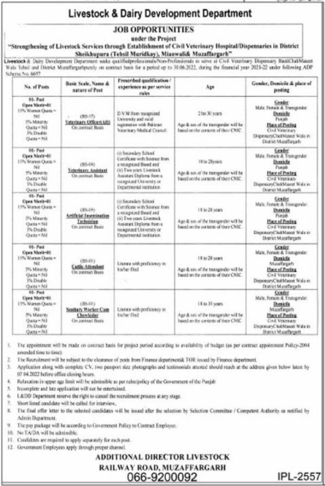 Livestock and Dairy Development Department Muzaffargarh, mianwali, sheikhupura, muzaffargarh and muridke Punjab Pakistan invites applications from eligible candidates for the post of cattle attendant, veterinary assistant, veterinary officer, artificial insemination technician and sanitary worker cum chowkidar as per advertisement of March 11, 2022 published in daily Daily Pakistan Newspaper. Matric, Primary and Master etc. educational qualification will be preferred.