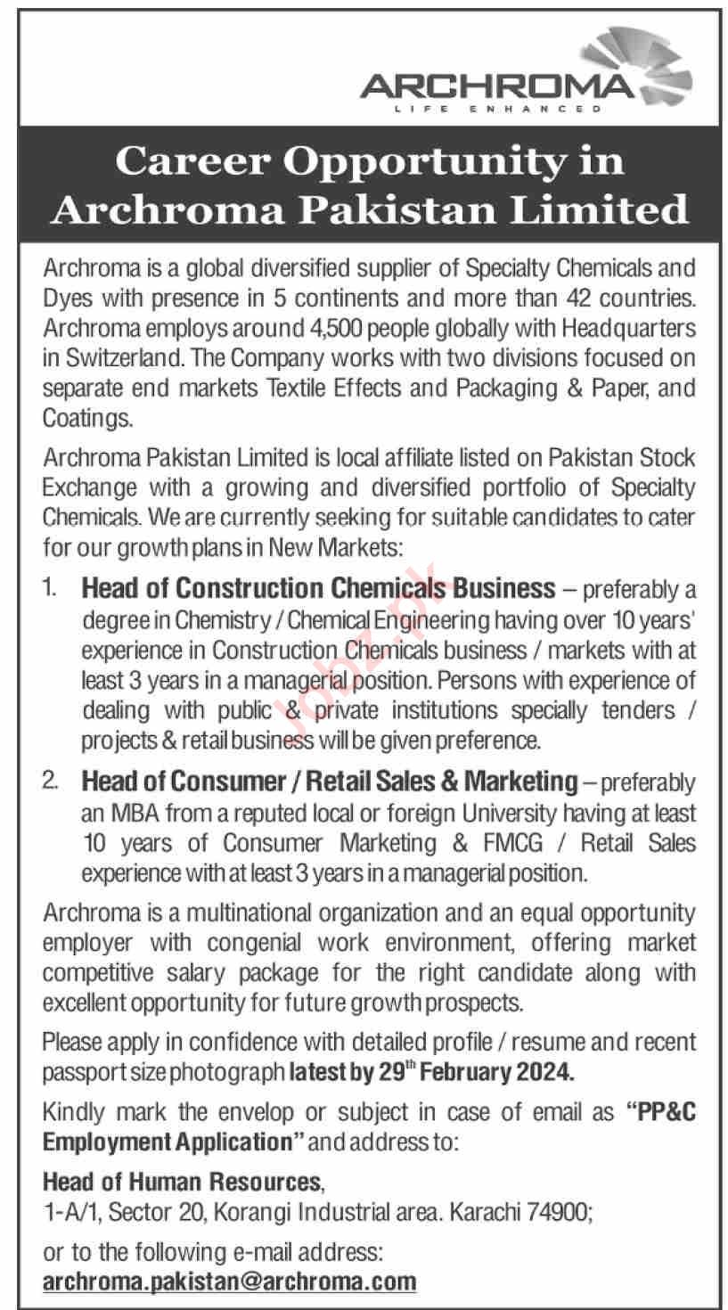 Archroma Pakistan Limited jobs advertisement dated about 21 January 2024 in daily Dawn Newspaper invites application for the vacant post of head of retail sales marketing, head of consumer and head of construction chemical business in Karachi, karachi Sindh Pakistan. Educational qualifications required Master, MS and MBA etc.