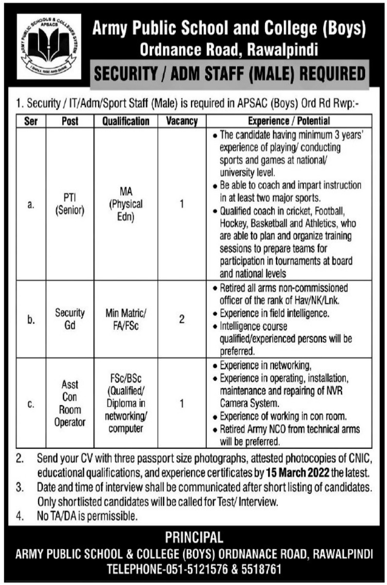 Positions Available At Army Public School & College APS&C