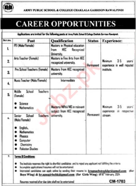 Army Public School & College APS&C Rawalpindi, rawalpindi Punjab Pakistan invites applications from eligible candidates for the post of female preschool teacher, pakistan studies teacher, english teacher, chemistry teacher, female arts teacher, mathematics teacher, physics teacher, pti, music teacher, computer teacher, female science teacher, female middle school teacher and female mathematics teacher as per advertisement of February 4, 2024 published in daily Nawaiwaqt Newspaper. Candidates with Master, MS and Mphil etc. educational background will be preferred.