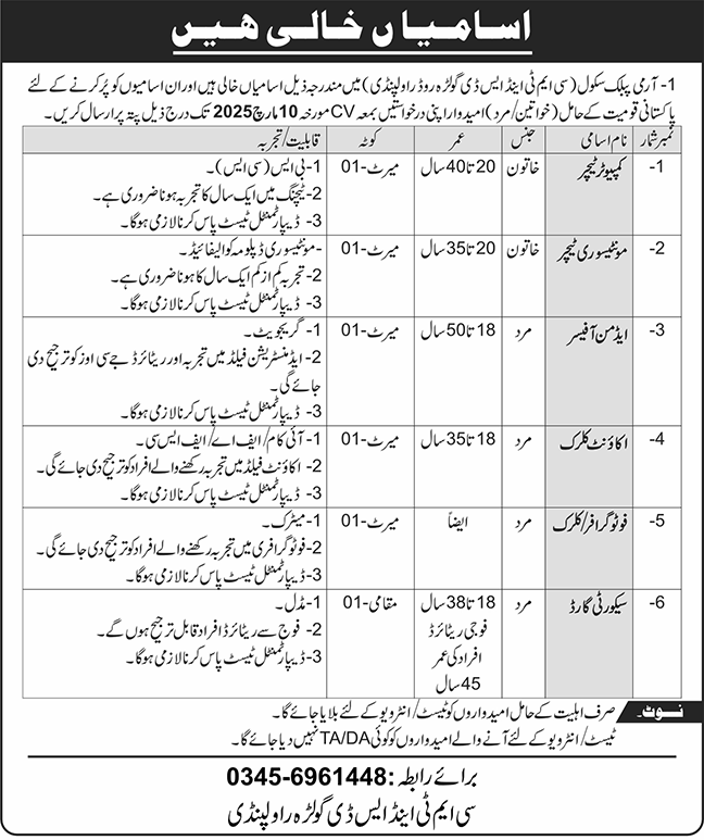 Vacant posts including photographer, clerk, computer teacher, admin officer, montessori teacher, security guard and account clerk are announced in Army Public School Rawalpindi, rawalpindi Punjab Pakistan as per 23 February 2025 advertisement in daily Nawaiwaqt Newspaper. Preferred Education is Bachelor, Middle, Matric and Master etc.