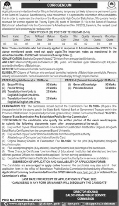 Vacant posts including tehsildar are announced in BPSC Balochistan Public Service Commission Quetta, quetta, sibi, naseerabad, makran, kalat and zhob Balochistan Pakistan as per 5 April 2023 advertisement in daily Jang Newspaper. Persons with Bachelor etc. education can apply.