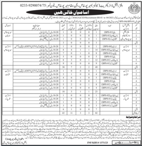 College Education Department Mirpur Khas, mirpur khas, tharparkar and umerkot Sindh Pakistan invites applications from eligible candidates for the post of lab attendant, naib qasid, sanitary worker, mali, chowkidar and driver as per advertisement of April 14, 2023 published in daily Jang Newspaper. Middle and Primary etc. educational qualification will be preferred.