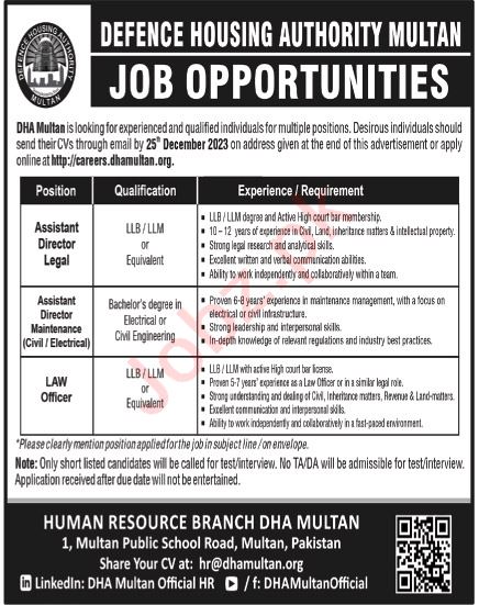 Defence Housing Authority DHA jobs advertisement dated about 17 December 2023 in daily Nation Newspaper invites application for the vacant post of assistant director maintenance civil, law officer, assistant director maintenance electrical and assistant director legal in Multan, multan Punjab Pakistan. Preferred Education is LLM, B.E, Bachelor and LLb etc.