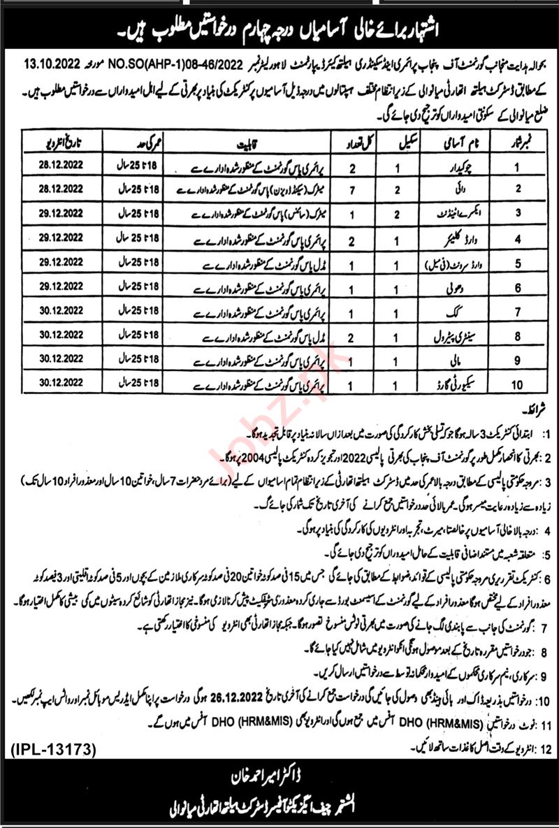 District Health Authority Mianwali, mianwali Punjab Pakistan invites applications from eligible candidates for the post of xray attendant, ward cleaner, female ward servant, sanitary patrol, chowkidar, dhobi, dai, cook, security guard and mali as per advertisement of December 18, 2022 published in daily Nawaiwaqt Newspaper. Educational qualifications required Middle, Matric and Primary etc.