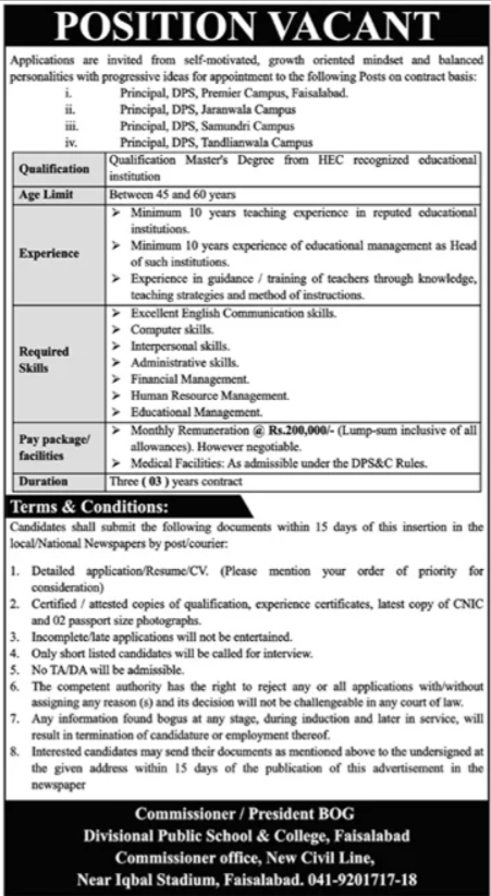 Latest Divisional Public School & College Management Posts Faisalabad 2025