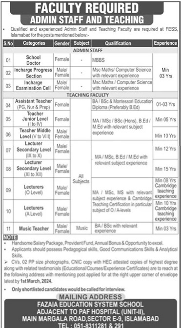 Fazaia Education System School Islamabad, islamabad Islamabad Pakistan invites applications from eligible candidates for the post of assistant teacher, incharge progress section, music teacher, teacher middle level, lecturer o level, school doctor, female teacher, lecturer secondary level, incharge examination cell and lecturer a level as per advertisement of February 20, 2024 published in daily The News Newspaper. Preferred Education is MBBS, M.ed, B.ed, MA, BA and M.sc etc.