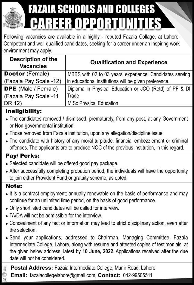 Fazaia Inter College is looking for candidates for following posts as per job advertisement published in daily Express Newspaper of May 29, 2022 for location Lahore, lahore Punjab Pakistan: