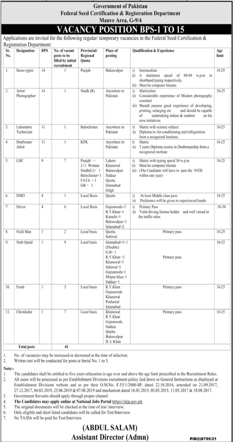 Federal Seed Certification & Registration Department FSC&RD Islamabad, islamabad Islamabad Pakistan invites applications from eligible candidates for the post of naib qasid, driver, dmo, chowkidar, photographer, ldc, frash, field man, artist, laboratory technician, draftsman and steno typist as per advertisement of June 16, 2022 published in daily Jang Newspaper. Persons with Middle, Matric, Primary, Others and Intermediate etc. education can apply.