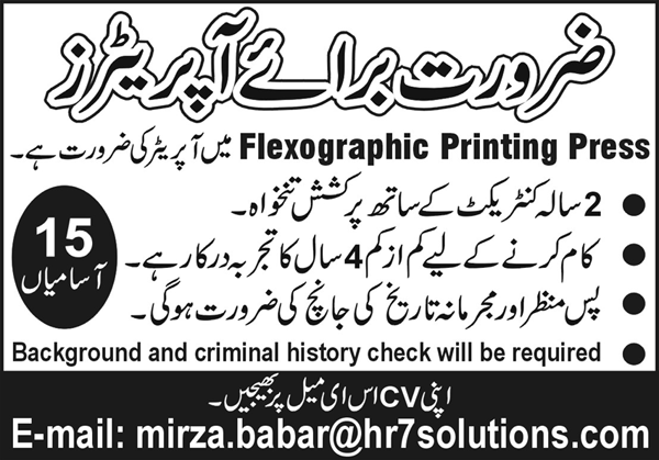 Flexographic Printing Press Lahore, lahore Punjab Pakistan invites applications from eligible candidates for the post of operator as per advertisement of September 14, 2024 published in daily Nawaiwaqt Newspaper. Preferred Education is Intermediate and Bachelor etc.