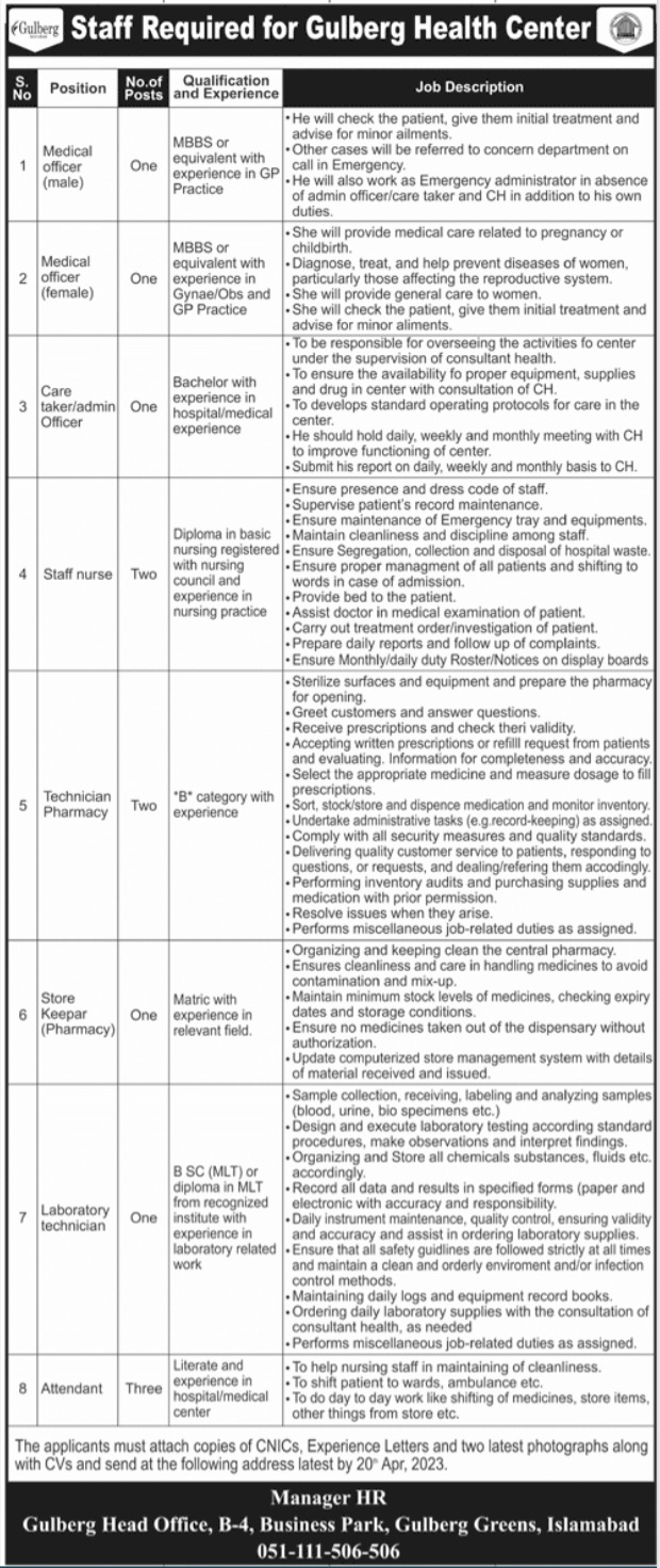 Gulberg Health Center Islamabad, islamabad Islamabad Pakistan invites applications from eligible candidates for the post of laboratory technician, female medical officer, care taker, attendant, male medical officer, staff nurse, technician pharmacy, admin officer and store keeper pharmacy as per advertisement of April 2, 2023 published in daily Jang Newspaper. Candidates with B Pharmacy, Matric, Bachelor, Intermediate, Others, Primary and MBBS etc. educational background will be preferred.