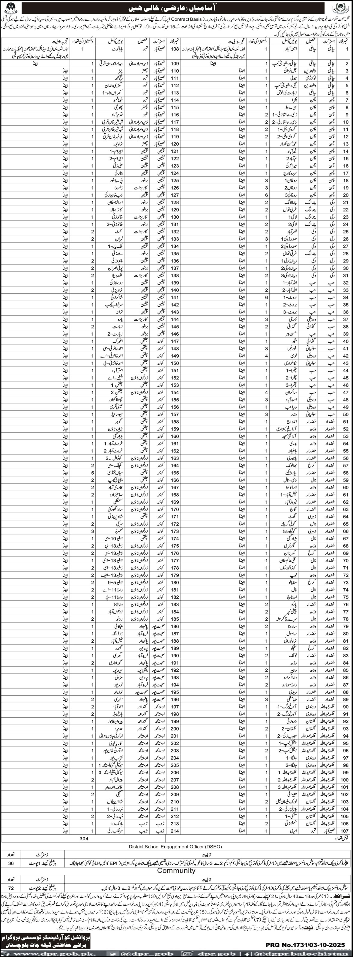 Vacant posts including district school engagement officer dseo are announced in Health Department Zhob, duki, chaghi, naseerabad, hub, zhob, chaman, killa abdullah and khuzdar Balochistan Pakistan as per 4 October 2025 advertisement in daily Other Newspaper. Preferred Education is Bachelor etc.