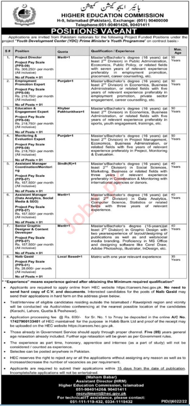 Higher Education Commission HEC jobs advertisement dated about 3 April 2023 in daily Ausaf Newspaper invites application for the vacant post of graphic designer, education engagement expert, project director, employment promotion expert, assistant manager coordination, naib qasid, assistant manager data analytics, monitoring evaluation expert, assistant manager social media seo, content developer and assistant manager monitoring in Islamabad, islamabad Islamabad Pakistan. Candidates with Master, Bachelor and Matric etc. educational background will be preferred.