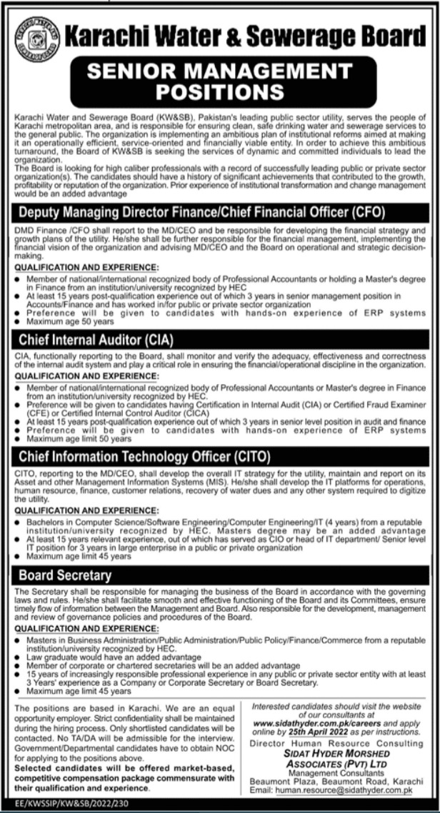 Karachi Water & Sewerage Board jobs advertisement dated about 10 April 2022 in daily Jang Newspaper invites application for the vacant post of chief financial officer, chief information technology officer cito, chief internal auditor cia and deputy managing director finance in Karachi, karachi Sindh Pakistan. BIT, Master, ACCA, BCS, CA and B.E etc. educational qualification will be preferred.