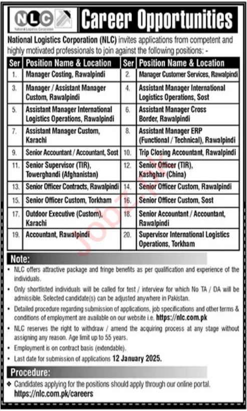 National Logistics Corporation NLC jobs advertisement dated about 29 December 2024 in daily The News Newspaper invites application for the vacant post of assistant manager cross border, assistant manager international logistics operations, officer tir, trip closing accountant, assistant manager custom, assistant manager erp, officer custom, outdoor executive, manager customer care services, supervisor, officer contracts, manager costing, supervisor international logistics operation, manager custom and accountant in Rawalpindi, karachi and rawalpindi Punjab Pakistan. Candidates with Master and Bachelor etc. educational background will be preferred.