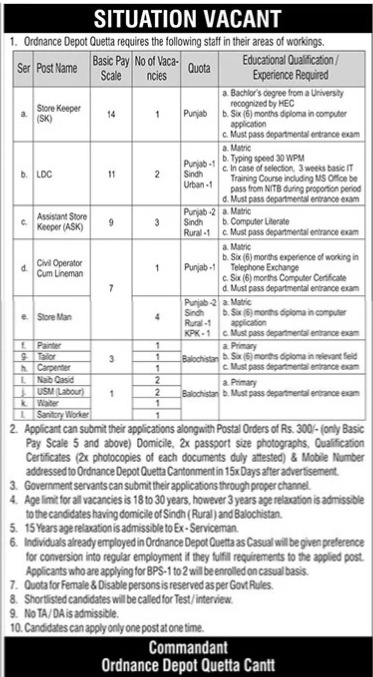 Vacant posts including naib qasid, painter, sanitary worker, usm labor, civil operator cum lineman, carpenter, ldc, waiter, tailor, store man, assistant store keeper and store keeper are announced in Ordnance Depot Quetta, quetta Balochistan Pakistan as per 12 November 2023 advertisement in daily The News Newspaper. Persons with Primary, Bachelor and Matric etc. education can apply.