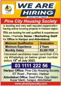Vacant posts including sales staff and marketing staff are announced in Pine City Housing Society Haripur, haripur and abbottabad Khyber Pakhtunkhwa KPK Pakistan as per 11 July 2023 advertisement in daily Aaj Newspaper. Bachelor etc. educational qualification will be preferred.