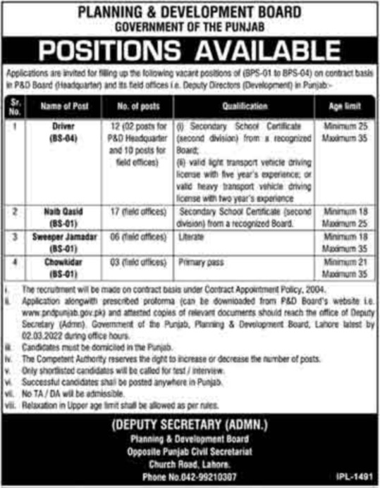 Planning and Development Board invites applications for job positions advertised in daily Dunya dated 11 February 2022 for following vacancies in Lahore Punjab Pakistan.
