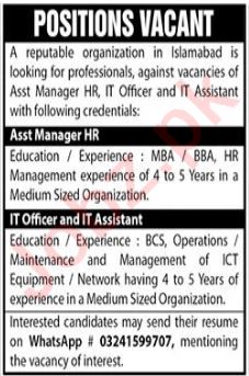 Private Organization invites applications for job positions advertised in daily The News dated 26 August 2024 for following vacancies in Islamabad, islamabad Islamabad Pakistan.