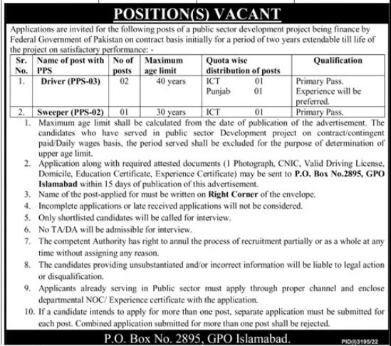Public Sector Organization jobs advertisement dated about 22 November 2022 in daily Jang Newspaper invites application for the vacant post of sweeper and driver in Islamabad, islamabad Islamabad Pakistan. Primary etc. educational qualification will be preferred.