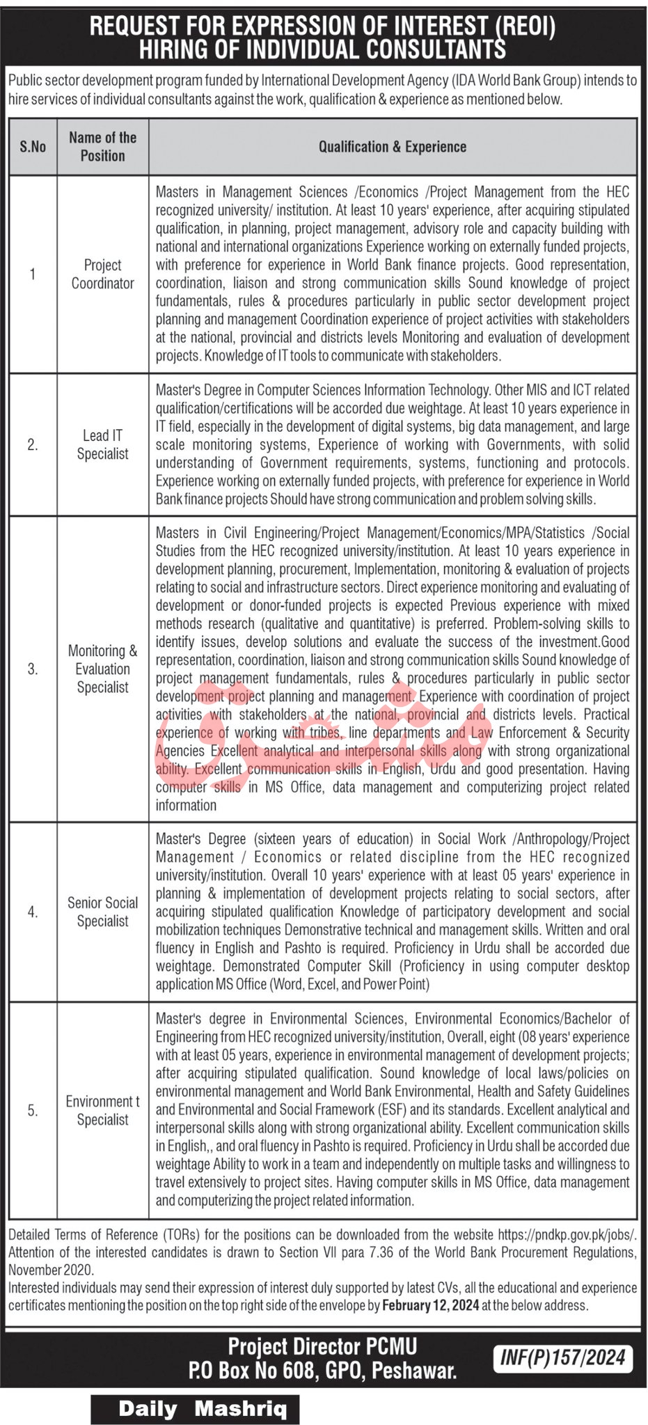 Public Sector Organization Peshawar, peshawar Khyber Pakhtunkhwa KPK Pakistan invites applications from eligible candidates for the post of project coordinator, monitoring evaluation specialist, environment specialist, lead it specialist and social specialist as per advertisement of January 29, 2024 published in daily Mashriq Newspaper. Persons with Master and MS etc. education can apply.