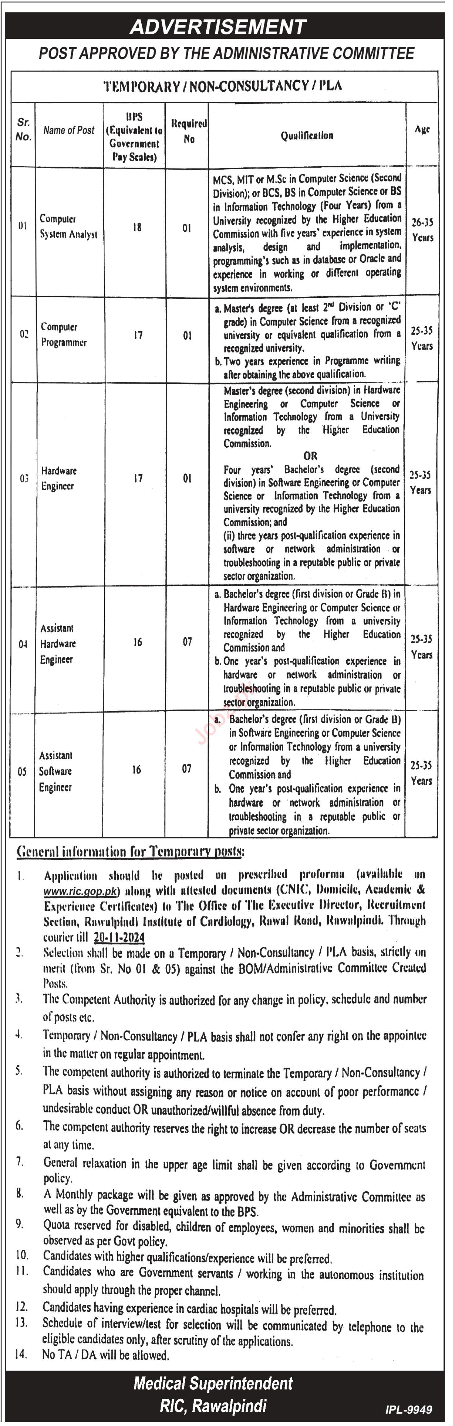 Rawalpindi Institute of Cardiology Rawalpindi, rawalpindi Punjab Pakistan invites applications from eligible candidates for the post of assistant hardware engineer, computer programmer, hardware engineer, computer system analyst and assistant software engineer as per advertisement of November 3, 2024 published in daily Express Tribune Newspaper. Preferred Education is Bachelor and Master etc.