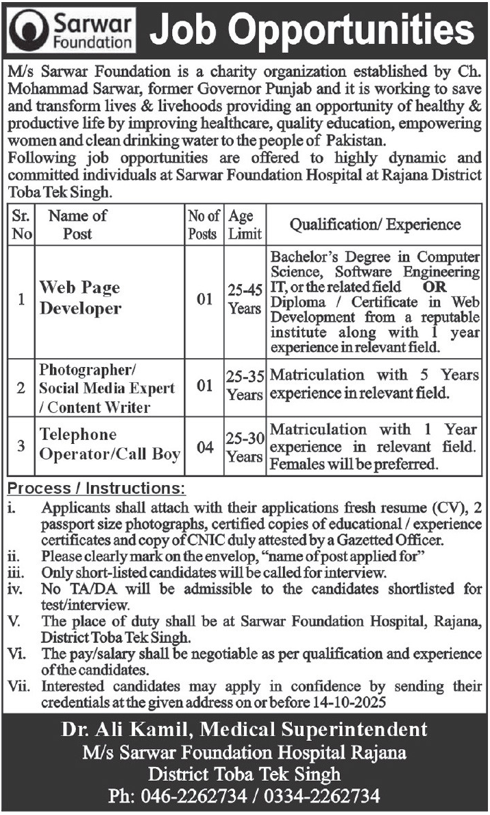 Sarwar Foundation Toba Tek Singh, toba tek singh Punjab Pakistan invites applications from eligible candidates for the post of social media expert, call boy, photographer, web page developer, telephone operator and content writer as per advertisement of September 28, 2025 published in daily Express Tribune Newspaper. Educational qualifications required Bachelor and Matric etc.