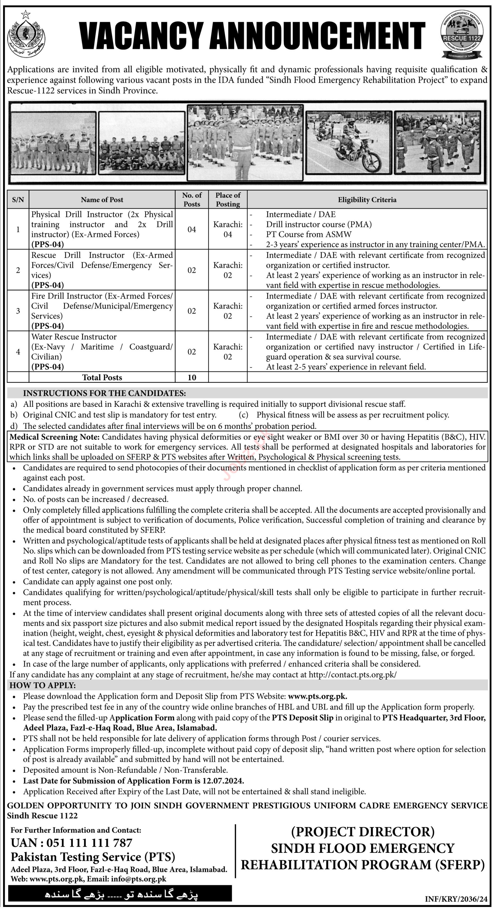 Sindh Emergency Rescue Service 1122 jobs advertisement dated about 23 June 2024 in daily Express Tribune Newspaper invites application for the vacant post of physical drill instructor, rescue drill instructor, water rescue instructor and fire drill instructor in Karachi, karachi Sindh Pakistan. Candidates with DAE and Intermediate etc. educational background will be preferred.