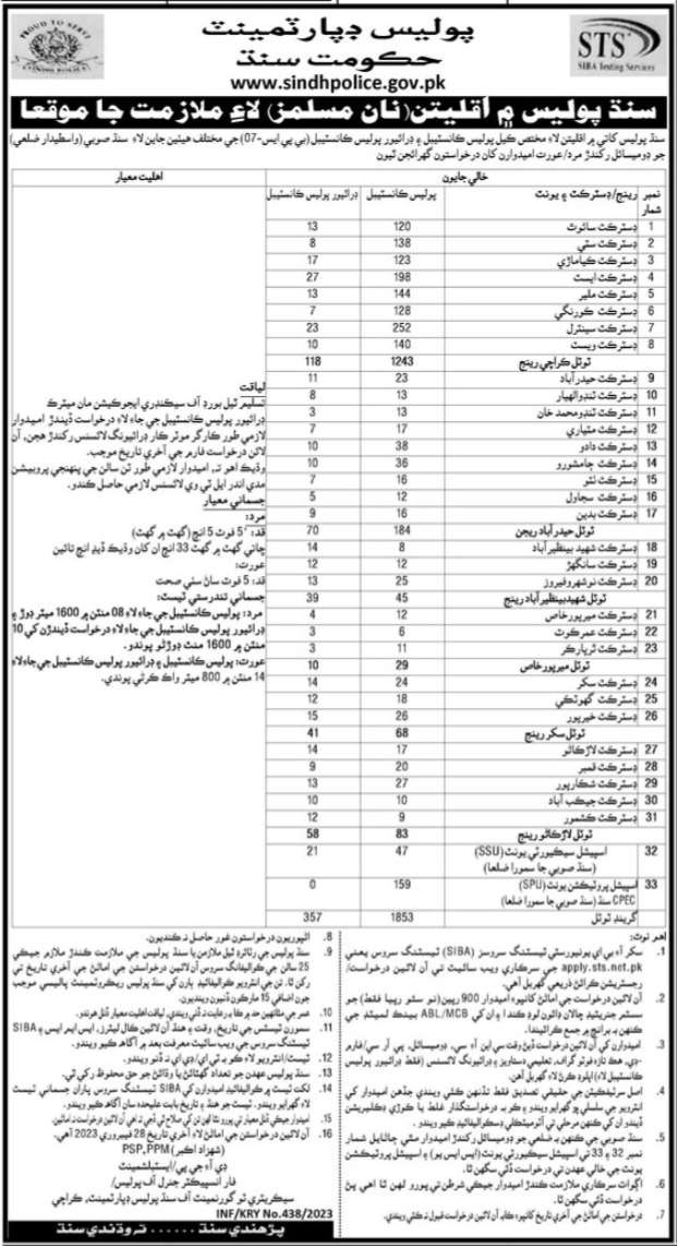 Sindh Police invites applications for job positions advertised in daily Kawish dated 10 February 2023 for following vacancies in Karachi, karachi Sindh Pakistan.