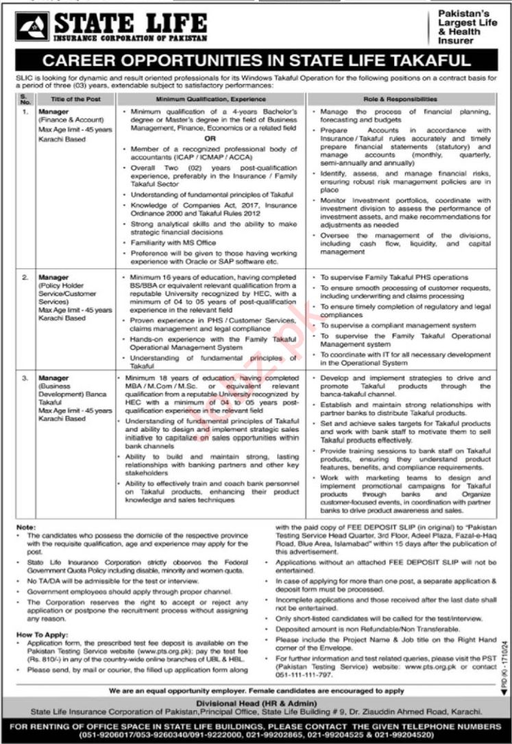 Vacancies in State Life Insurance Corporation of Pakistan Advertisement December 2024