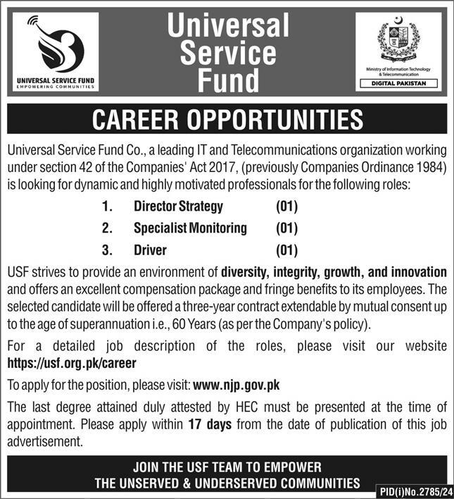 Universal Service Fund invites applications for job positions advertised in daily Express dated 25 October 2024 for following vacancies in Islamabad, islamabad Islamabad Pakistan.
