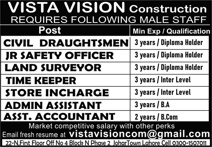 Vacant posts including safety officer, admin assistant, time keeper, civil draughtsman, assistant accountant, land surveyor and store incharge are announced in Vista Vision Construction Johar Town Lahore, lahore Punjab Pakistan as per 29 June 2025 advertisement in daily Express Newspaper. Educational qualifications required Intermediate, Bachelor and DAE etc.