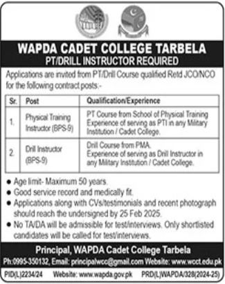 Wapda Cadet College Tarbela Tarbela, tarbela Khyber Pakhtunkhwa KPK Pakistan invites applications from eligible candidates for the post of physical training instructor and drill instructor as per advertisement of February 9, 2025 published in daily The News Newspaper. Candidates with Bachelor and Intermediate etc. educational background will be preferred.