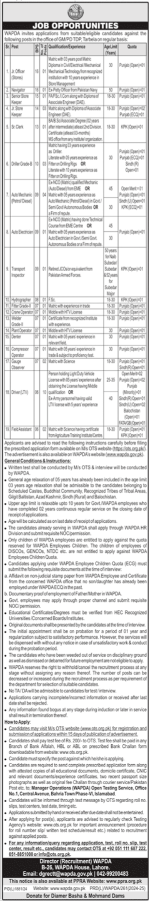 Water and Power Development Authority WAPDA is looking for candidates for following posts as per job advertisement published in daily Jang Newspaper of January 4, 2025 for location Tarbela, tarbela Khyber Pakhtunkhwa KPK Pakistan: