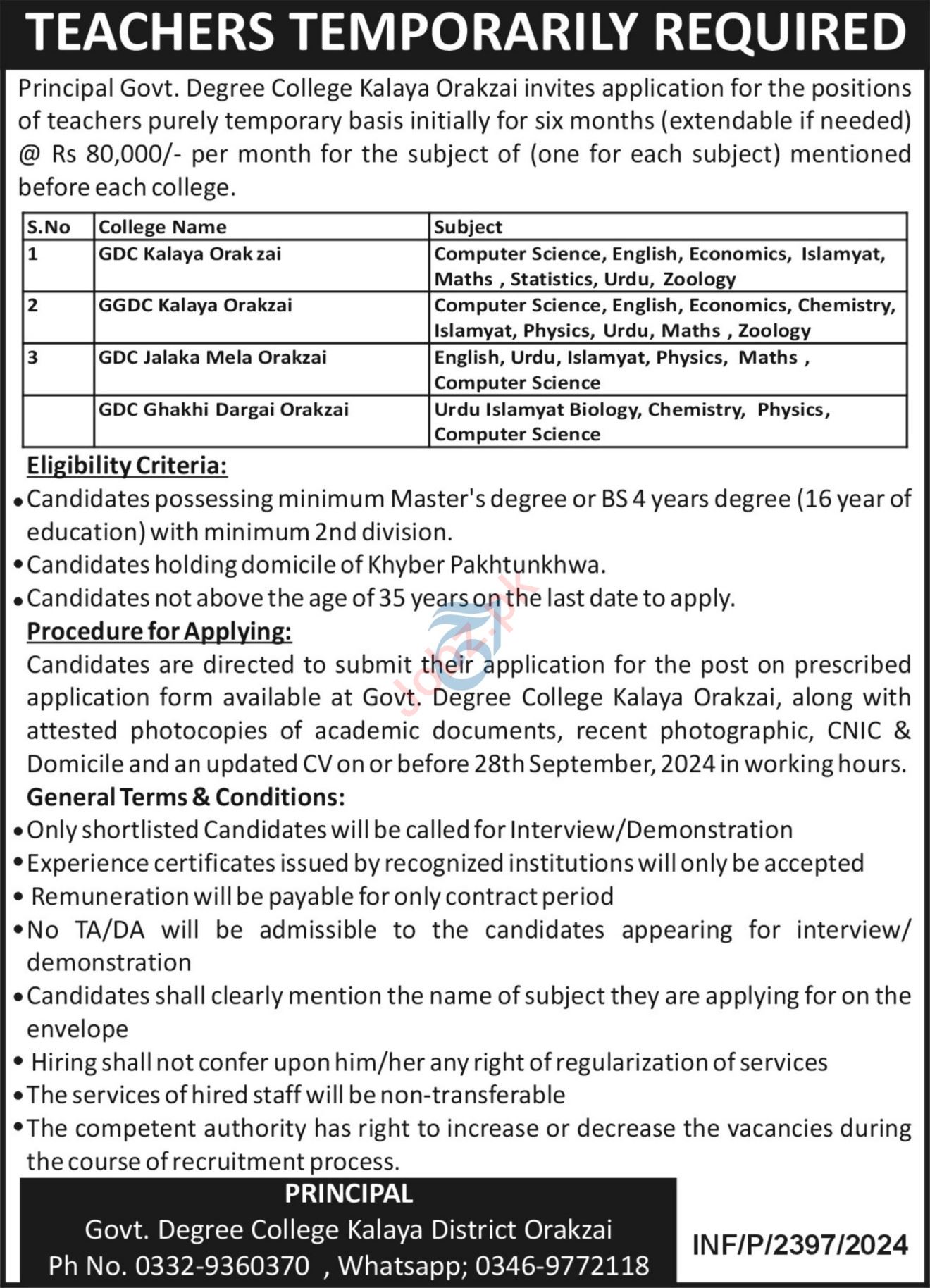 Government Degree College Orakzai, orakzai Khyber Pakhtunkhwa KPK Pakistan invites applications from eligible candidates for the post of islamiat teacher, computer science teacher, maths teacher, english teacher, chemistry teacher, zoology teacher, physics teacher, statistics teacher, urdu teacher and economics teacher as per advertisement of September 22, 2024 published in daily Aaj Newspaper. Master etc. educational qualification will be preferred.