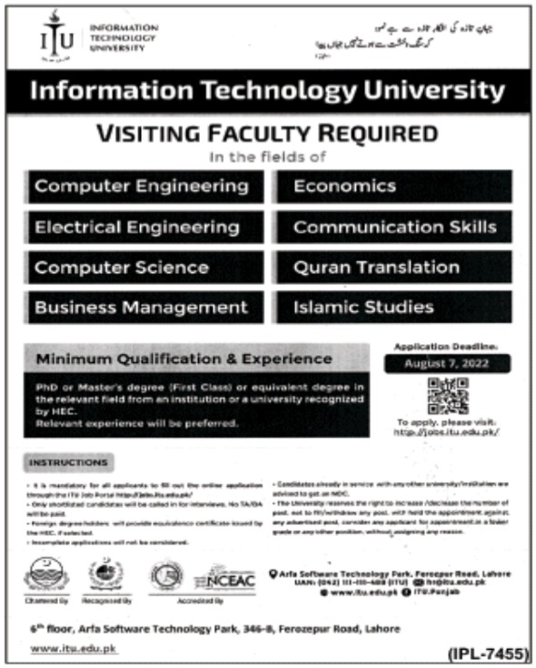 Vacant posts including visiting lecturer business management, visiting lecturer electrical engineering, visiting lecturer computer science, visiting lecturer economics, visiting lecturer computer engineering, visiting lecturer islamic studies, visiting lecturer communication skills and visiting lecturer quran translation are announced in Information Technology University ITU Lahore, lahore Punjab Pakistan as per 22 July 2022 advertisement in daily Nation Newspaper. Preferred Education is MS, Phd and Mphil etc.